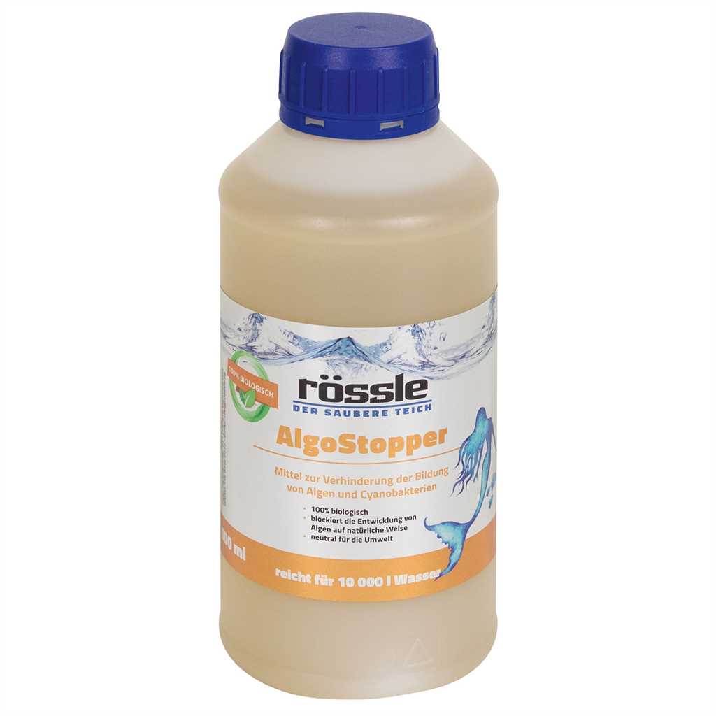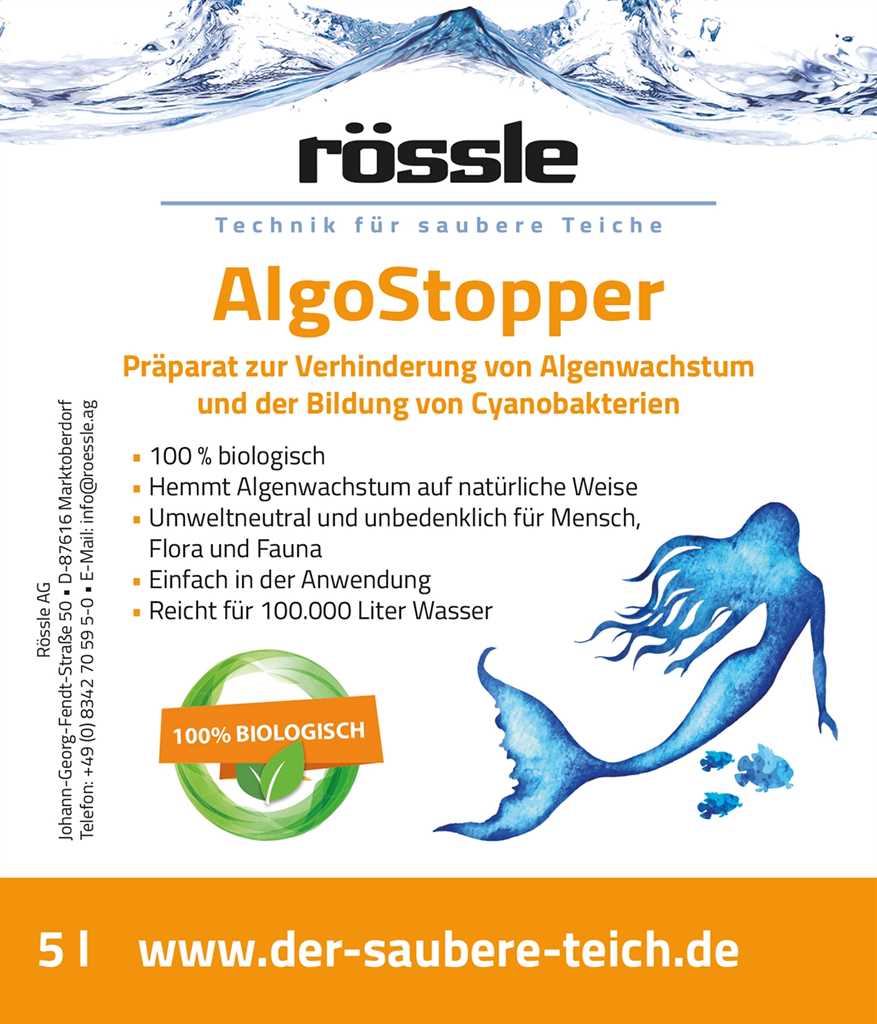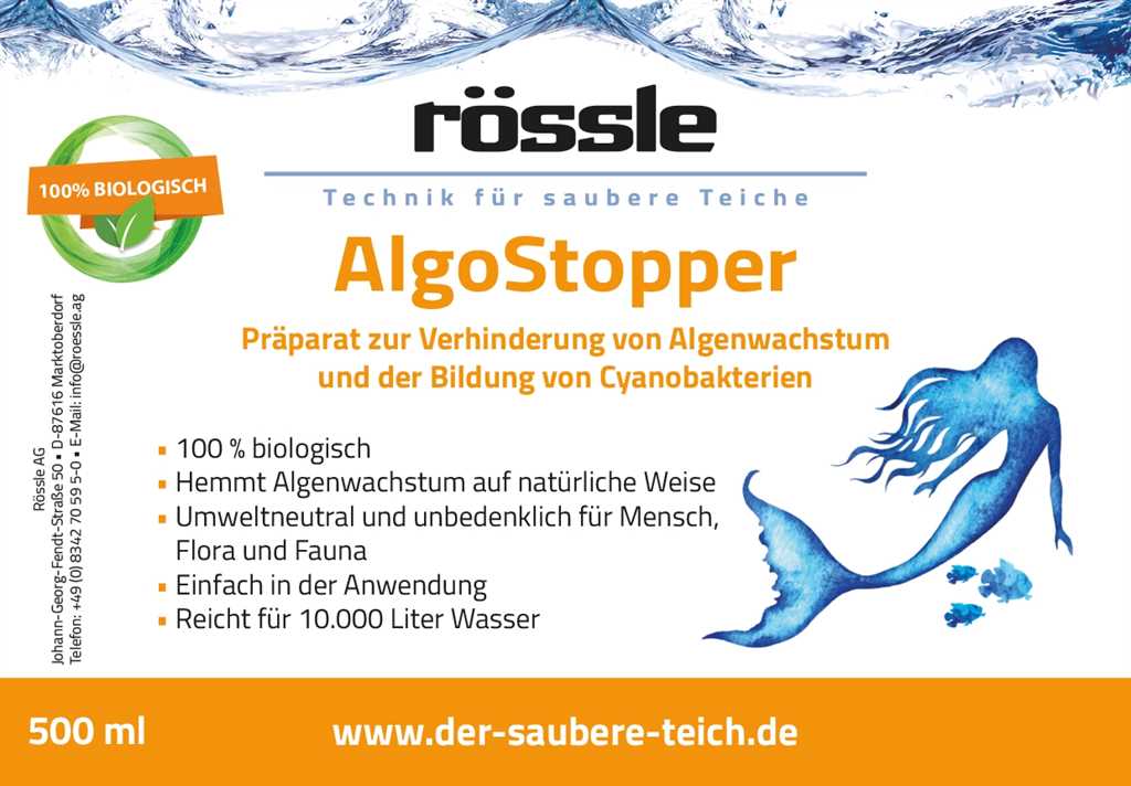 AlgoStopper, 500 ml, ist ein biologisches Präparat, das massives Auftreten von Schwebealgen und Fadenalgen und die Bildung von Cyanobakterien verhindert. Das Mittel ist umweltneutral und unbedenklich für Menschen, Tiere und Pflanzen.