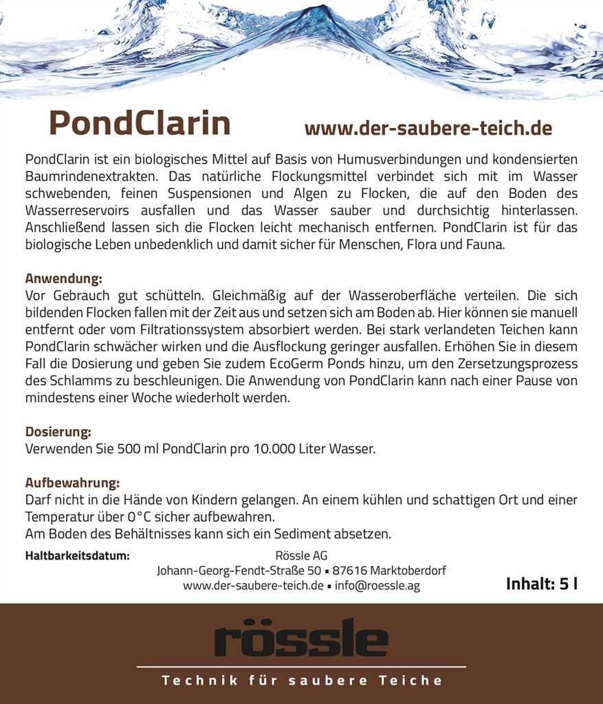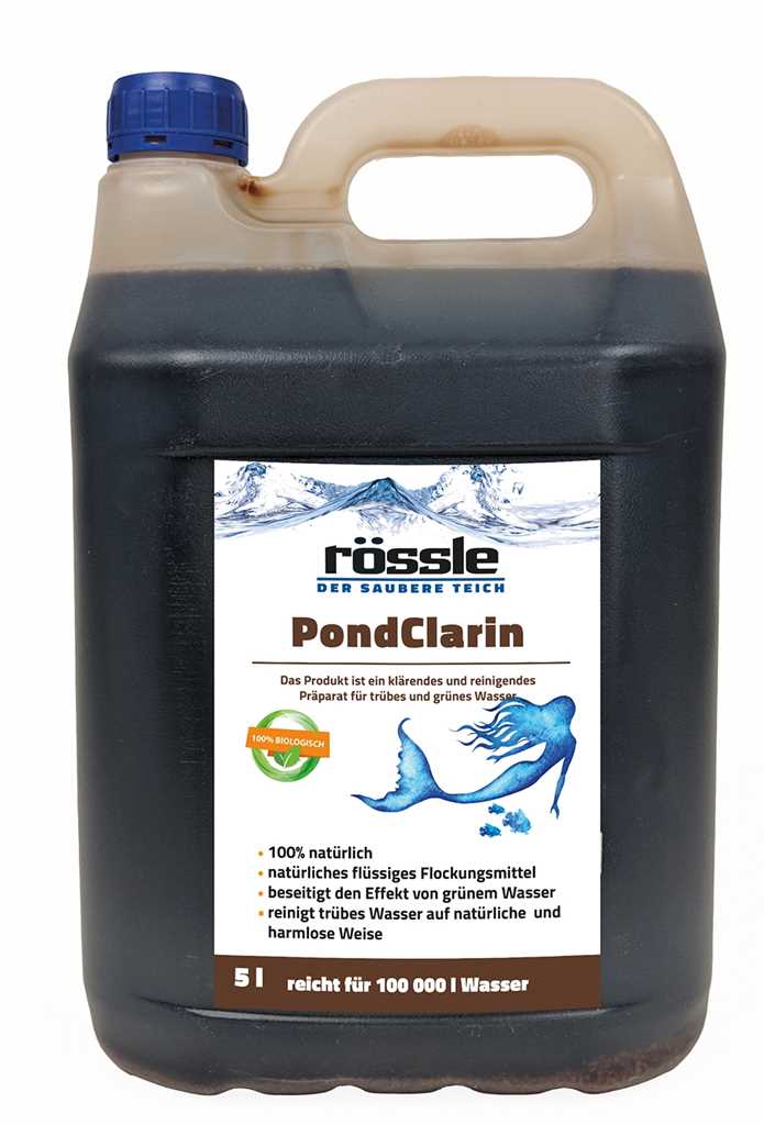 PondClarin, 5 l, ist ein biologisches Präparat, basierend auf Huminstoffen und kondensierten Rindenextrakten, zur Klärung und Reinigung von trübem und grünem Wasser. Das natürliche Flockungsmittel verbindet sich mit im Wasser schwebenden, feinen Suspensionen und Algen zu Flocken, die auf den Boden des Wasserreservoirs ausfallen und das Wasser sauber und durchsichtig hinterlassen.